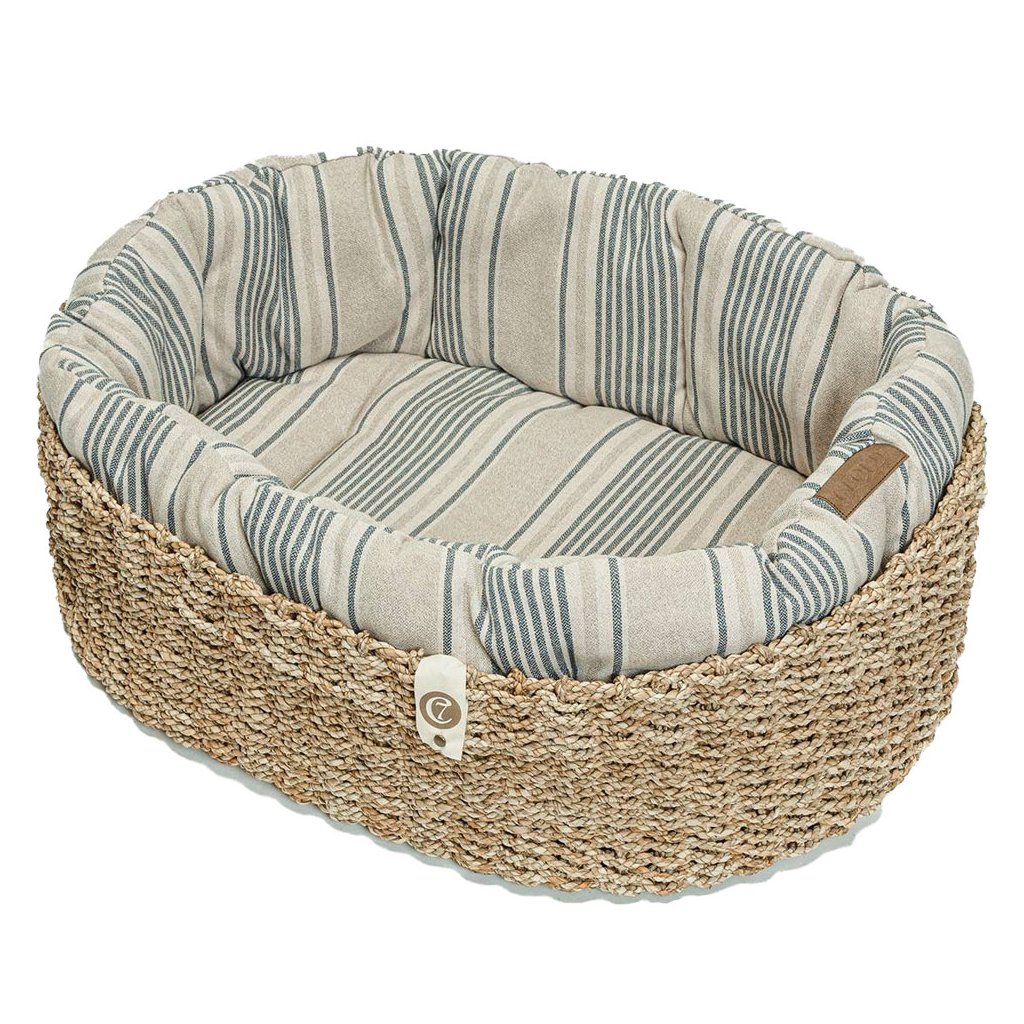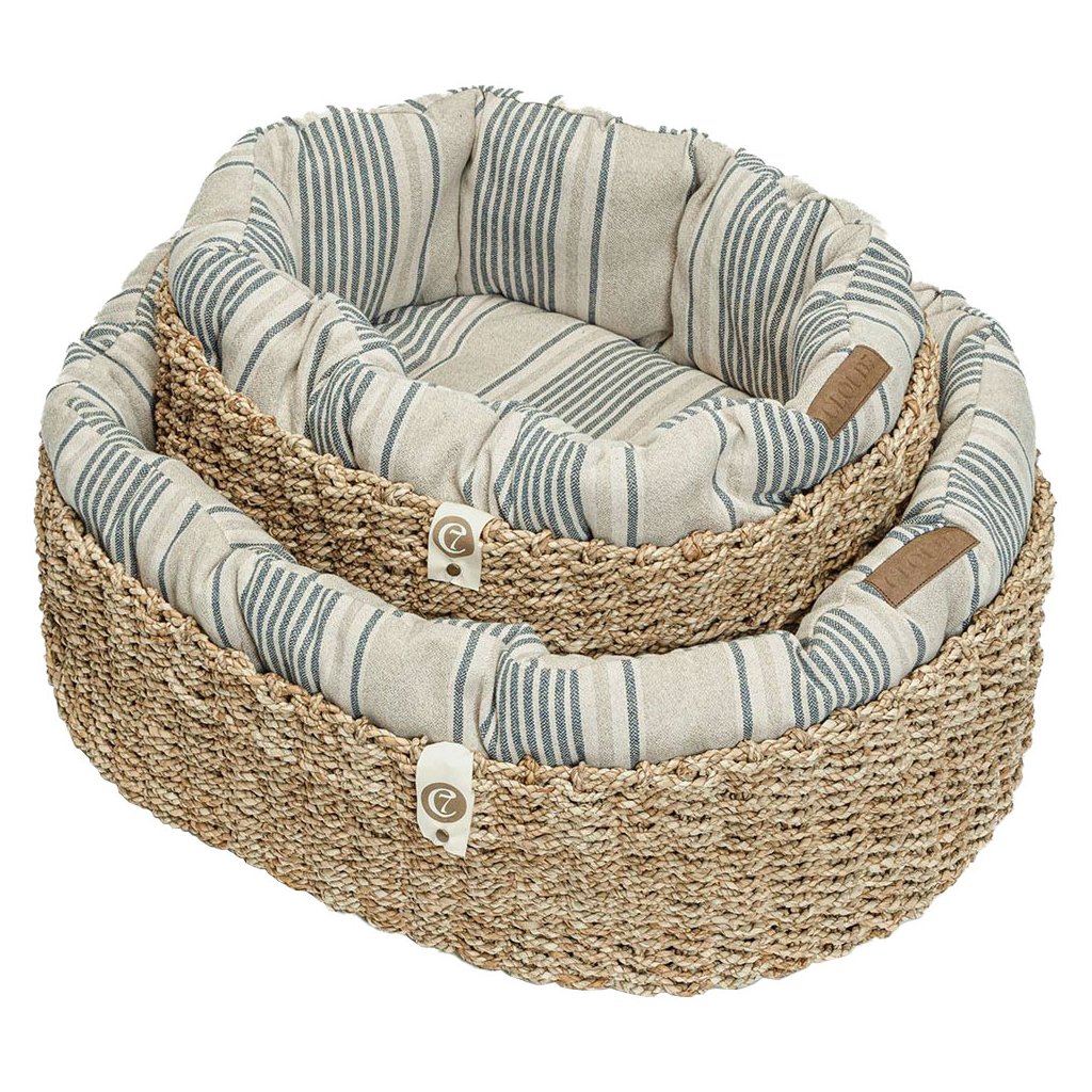 Luxusní pelíšek pro psy v proutěném koši. Ruční výroba v Německu.Oválný pelíšek Lazy je perfektní místo na spaní pro psy, kteří preferují skryté útočiště. Kvalitní pelíšek pro psa se skládá z ručně tkaného košíku z mořské trávy a měkkého vkládacího polštáře s vysokým okrajem. Útulný polštářek pro psa je potažen odolnou látkou, která vyniká snadnou údržbou, omyvatelností a letním vzhledem. Díky robustnímu materiálu lze polštář používat i samostatně. Pokud se vám již vnitřní pelíšek v košíku nelíbí, můžete ho snadno vyměnit za jiný.