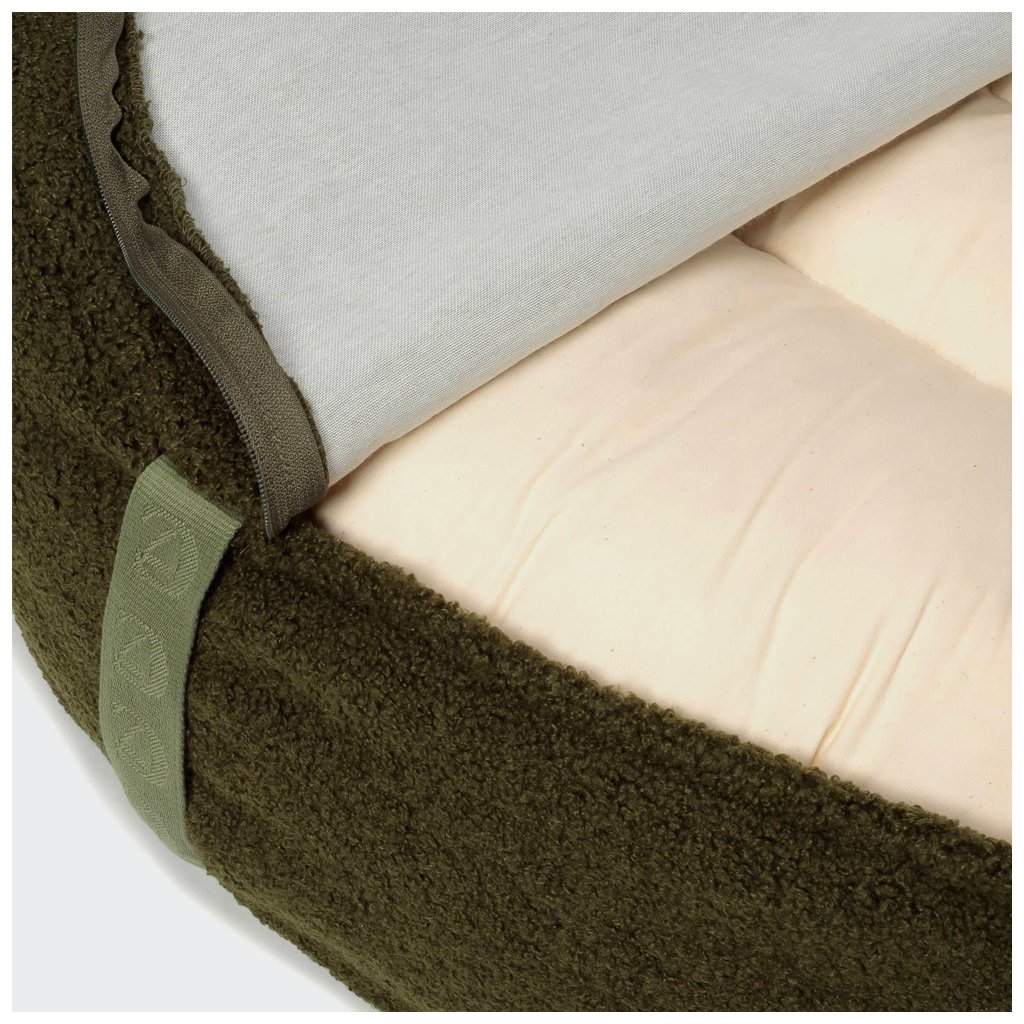 Pelíšek je vyhotovený z příjemných a zároveň praktických materiálů snadných na údržbu. Povlak pelíšku je ušitý z recyklovaného polyesteru a lze ho prát v pračce anebo vyměnit za nový. Povlak matrace je z organické bavlny.