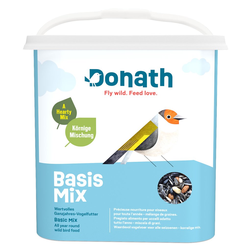 Krmivo pro volně žijící ptactvo. Vyrobeno v Německu.Basic Mix od značky Donath je krmná směs pro všechny ptačí labužníky, kteří rádi jedí zrní. Vitamíny nabitá směs s ovesnými a pšeničnými vločkami, loupanými slunečnicovými semínky, energeticky bohatými arašídy a aromatickým slunečnicovým olejem nenechá návštěvníky zahrady se silným zobákem na holičkách.