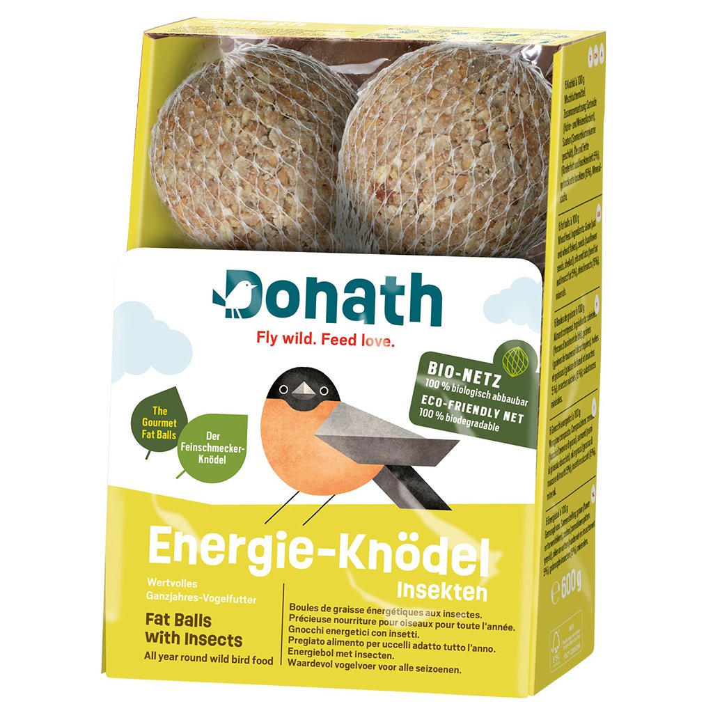 Krmivo pro volně žijící ptactvo. Vyrobeno v Německu.Lojové koule od značky Donath jsou pro ptáky skutečnou hostinou. Díky jedinečné směsi nejkvalitnějších obilovin, semen bohatých na bílkoviny, vysoce kvalitních olejů a tuků a také speciálnímu zpestření - hmyzímu tuku a sušenému hmyzu - poskytují ptákům nejen potřebnou dávku energie, ale také důležité vitamíny, minerály a stopové prvky. Chutné koule poskytují volně žijícím ptákům vysoce kvalitní bílkoviny a vysoce kalorické tuky, čímž podporují jejich zdraví a vitalitu.