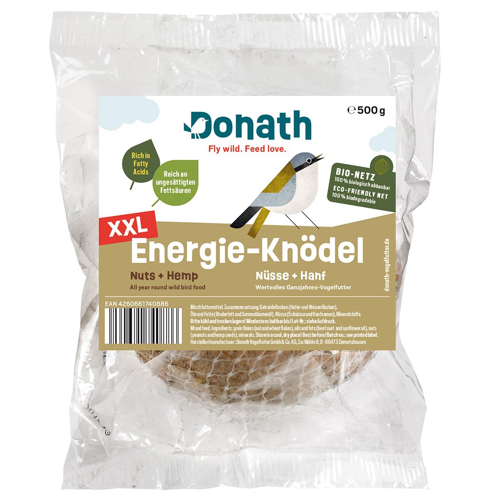 Krmivo pro volně žijící ptactvo. Vyrobeno v Německu.XXL potěšení pro opeřené návštěvníky zahrady a balkonu. Obří lojová koule od značky Donath s oříšky a konopnými semínky je v ekologické síťce, zatímco volně žijícím ptákům dodává tolik potřebnou energii. Se zdravými, chutnými ingrediencemi včetně přírodního, energizujícího tuku. Vhodné pro celoroční krmení divokých ptáků. S obilnými vločkami pro dobré trávení. Ideální do větších krmítek.