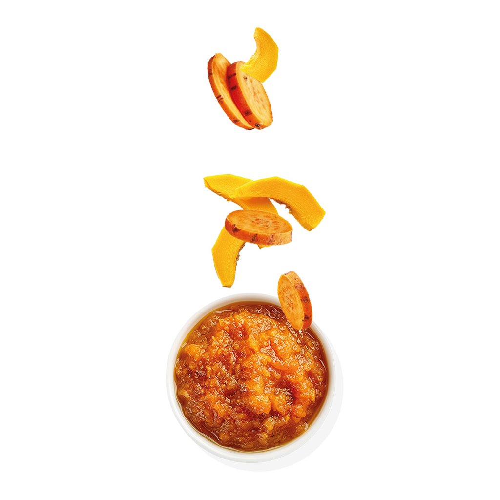 Čerstvá dýně* 36 %, čerstvá mrkev* 23 %, čerstvé sladké brambory* 11 %, rostlinné bílkoviny (hydrolyzované), jablečná vláknina, slunečnicový olej, rakytník řešetlákový 0,3 %, kurkuma 0,2 %, čekankový prášek 0,2 %. *mražené