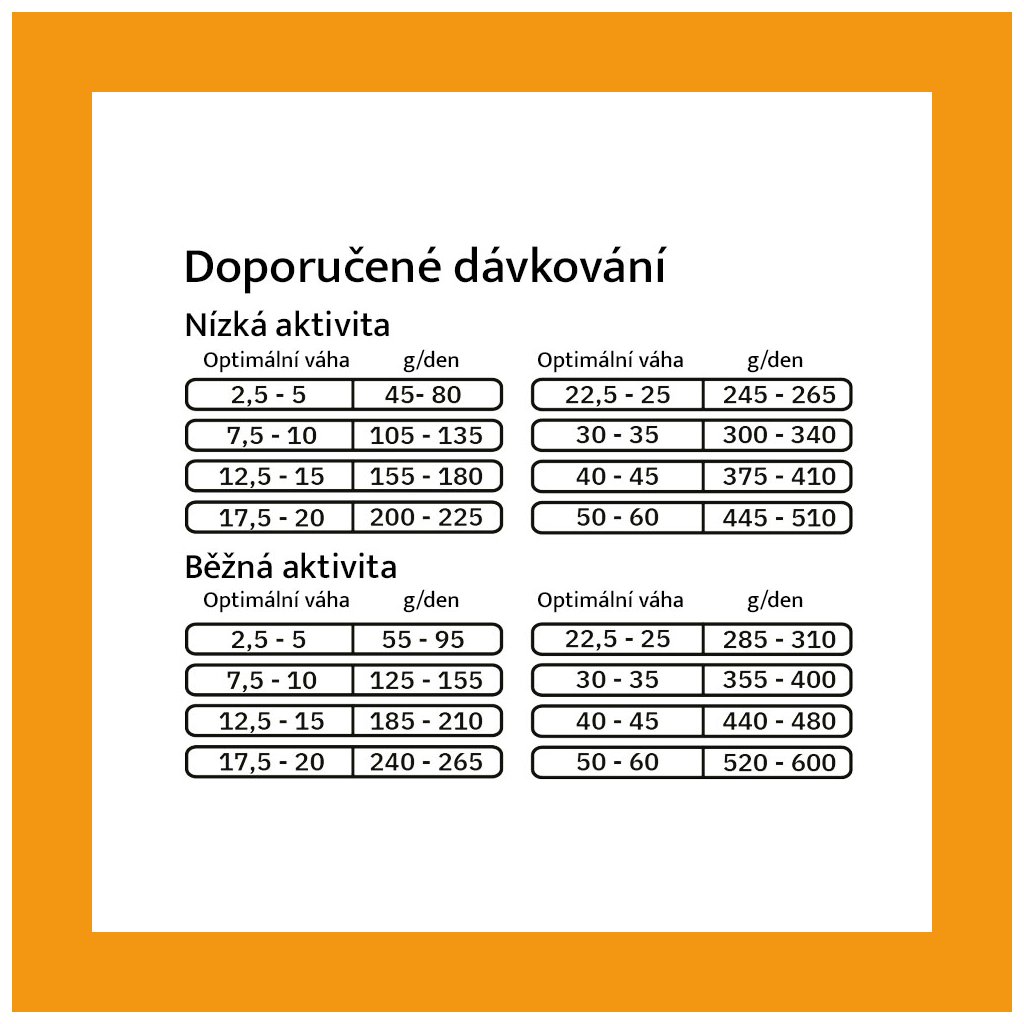 Zajistěte psovi přístup k čisté vodě. Doporučená denní dávka krmiva: viz tabulka. Uvedené údaje jsou orientační. Potřeby se liší v závislosti na věku, plemeni, chovu a aktivitě. Proto může být nutné množství krmiva individuálně upravit. Pokud jsou podávány také pamlsky nebo jiné doplňkové produkty, je třeba množství krmiva snížit. Denní množství by mělo být rozděleno do 2-3 porcí.
