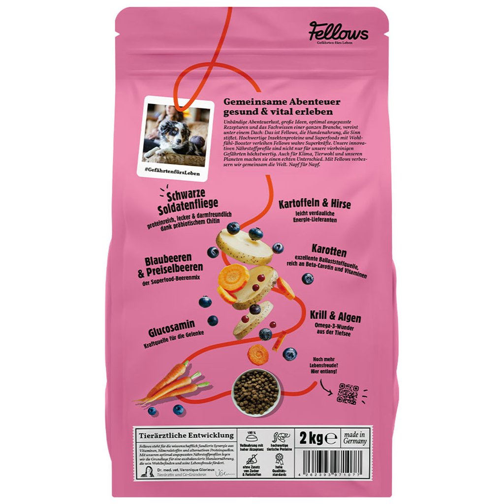 Hmyzí protein ve Fellows obsahuje všech dvacet aminokyselin nezbytných pro psy. Navzdory své malé velikosti hmyz nabízí nutriční výhody, které v mnoha ohledech předčí maso. Díky vysokému obsahu bílkovin jsou ideální pro psí krmivo. V kombinaci s dalšími složkami zajišťují druhově vhodnou stravu a podporují zdraví psa.
