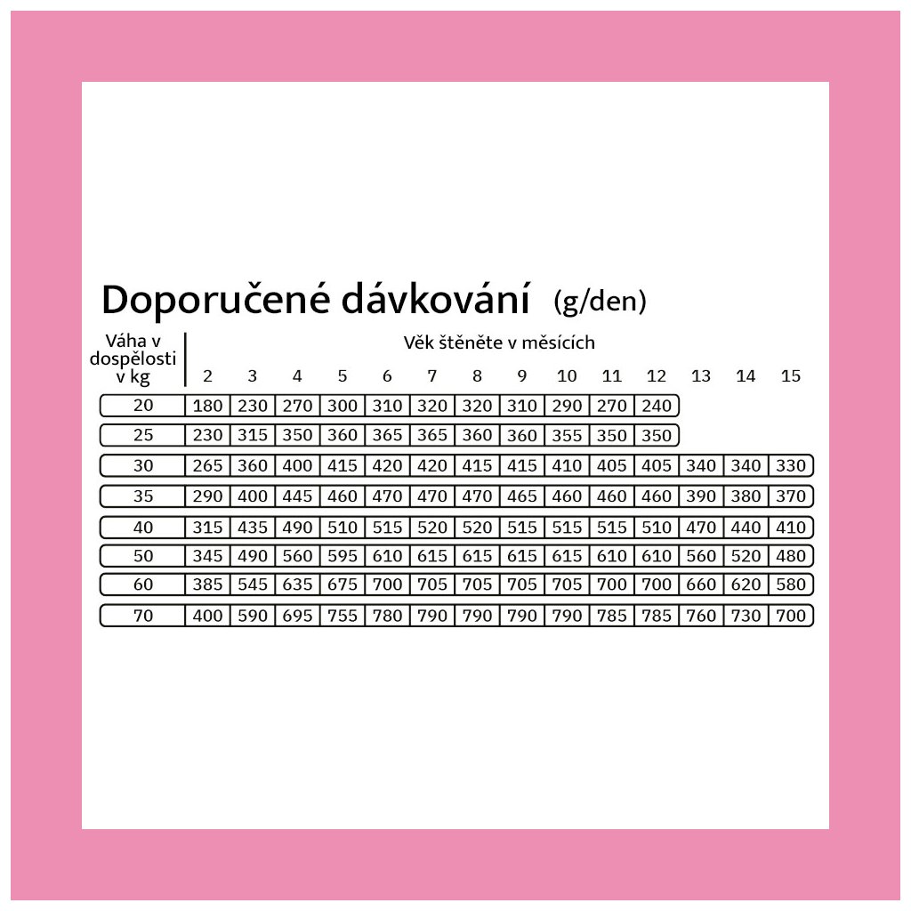 Zajistěte psovi přístup k čisté vodě. Doporučená denní dávka krmiva: viz tabulka. Uvedené údaje jsou orientační. Potřeby se liší v závislosti na věku, plemeni, chovu a aktivitě. Proto může být nutné množství krmiva individuálně upravit. Pokud jsou podávány také pamlsky nebo jiné doplňkové produkty, je třeba množství krmiva snížit. Denní množství by mělo být rozděleno do 2-3 porcí.