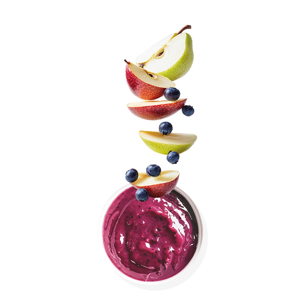 Čerstvá jablka* 33,5 %, čerstvé hrušky* 17 %, čerstvé borůvky* 4,5 %, rostlinné bílkoviny (hydrolyzované), jablečná vláknina, čekankový prášek 0,1 %. *mražené