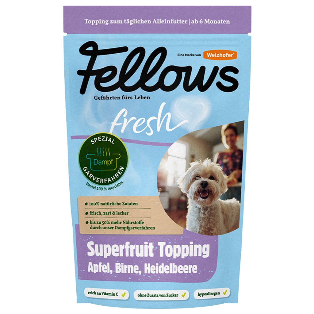 Opravdu, i psi mohou být milovníky ovoce. S Toppingem Superfruit od Fellows přichází do misky ovocná rozmanitost. Jablka, hrušky a borůvky přináší pestrou explozi vitamínů, která zaručeně rozhýbe každý psí ocásek a podpoří celkovou vitalitu vašeho psa.