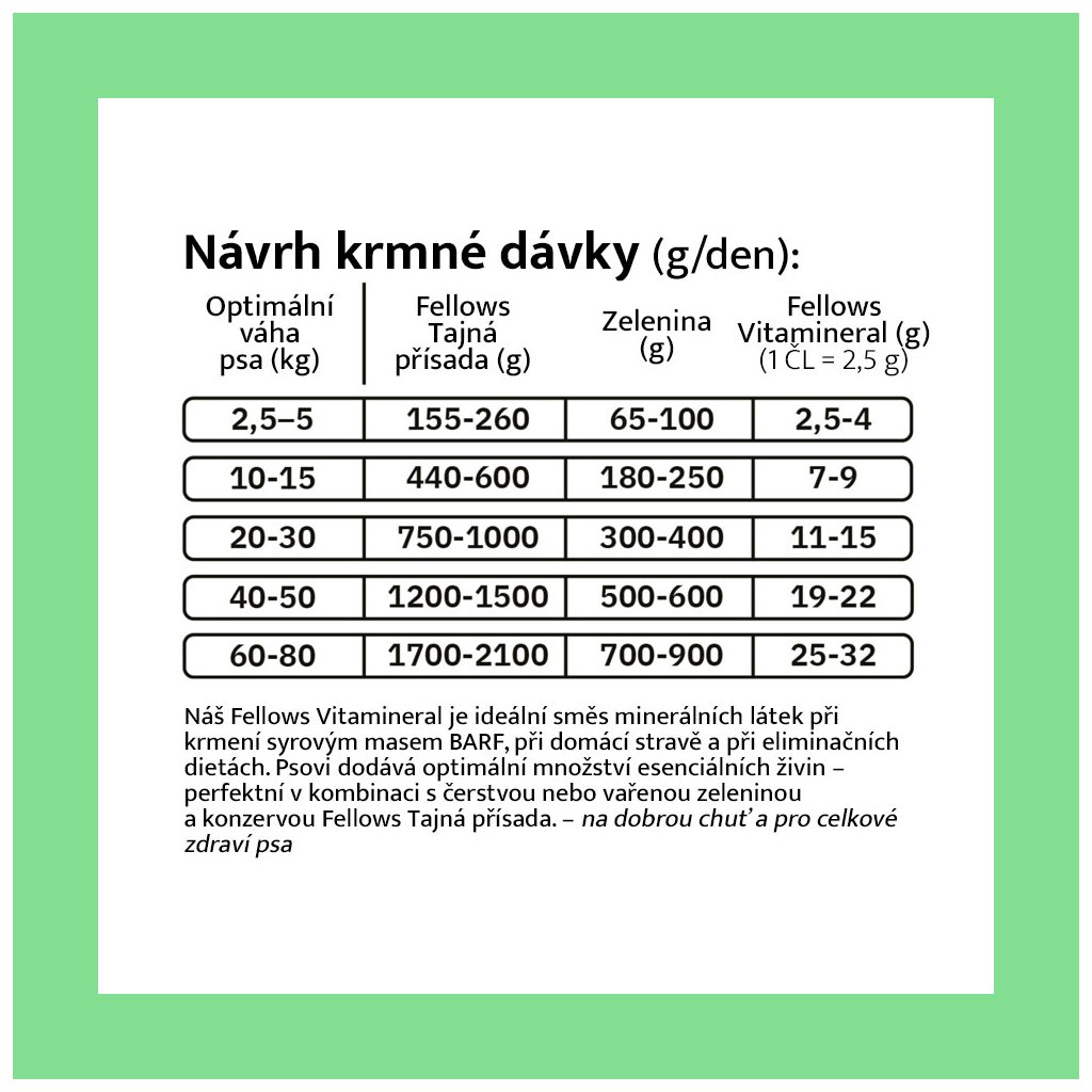 Vitamineral neobsahuje žádné živočišné složky, je hypoalergenní a velmi dobře stravitelný – ideální pro psy s alergiemi nebo citlivým zažíváním. Snadno lze kombinovat s krmivem a pamlsky Fellows.