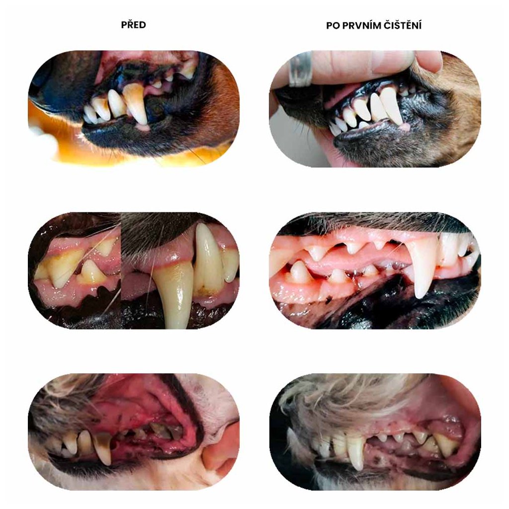 Jedno čištění ultrazvukovým čističem odpovídá asi tomu, jako kdybyste vašemu psovi ošetřili zuby jednou do roka. Výrazná změna je vidět hned po prvním ošetření. Čištění ultrazvukem je mimořádně důkladné při odstraňování plaku a zubního kamene. Vyžaduje mnohem menší tlak, zvyšuje komfort čištění a napomáhá při eliminaci bakterií.