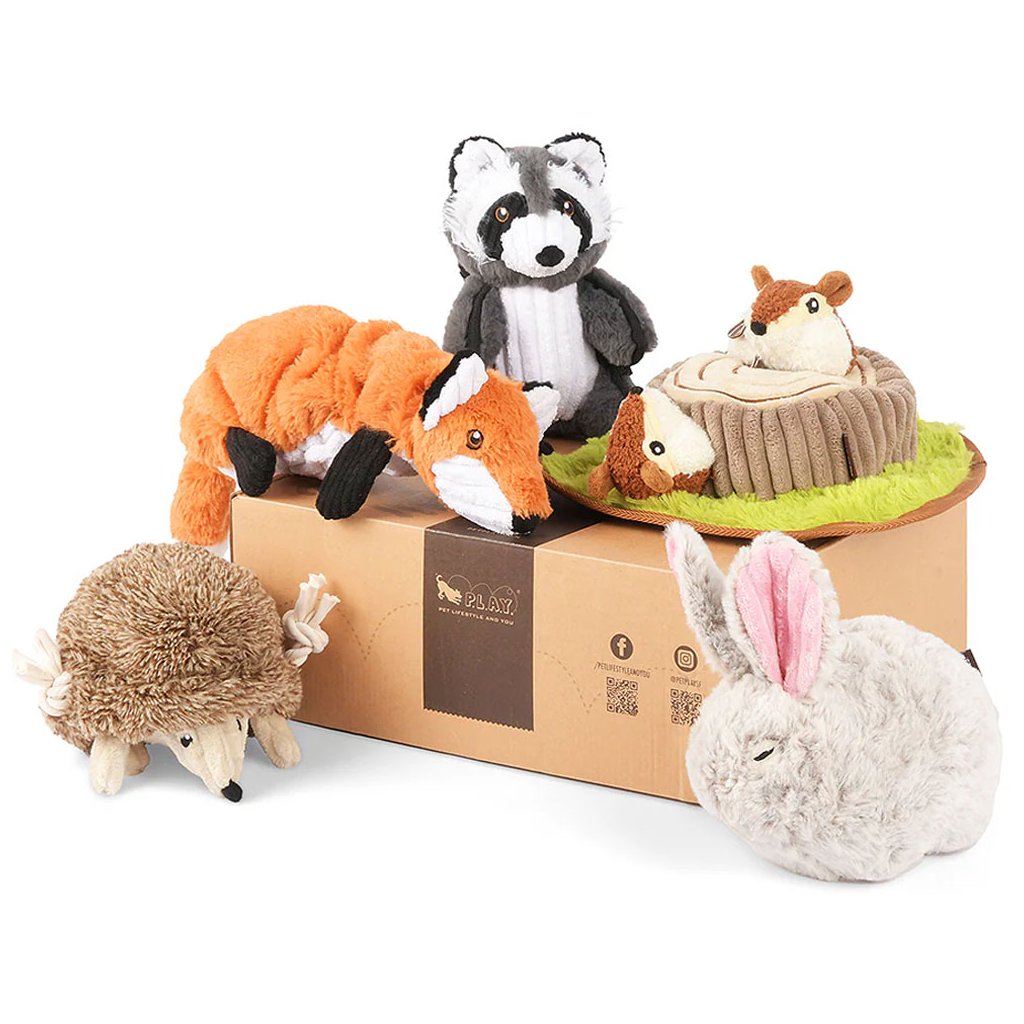 Dárkový set hraček pro psy. Vyrobeno z recyklovaných materiálů.Chlupáči, hledáš nová dobrodružství? Tady štěkáš na správný strom. Značka P.L.A.Y. přichází s rozmarnou kolekcí Forest Friends, která je inspirována nejoblíbenějšími lesními zvířátky: zajícem, ježkem, liškou, mývalem a čipmankem. Váš pes teď může okusit divokou přírodu a přitom zůstane v bezpečí domova.