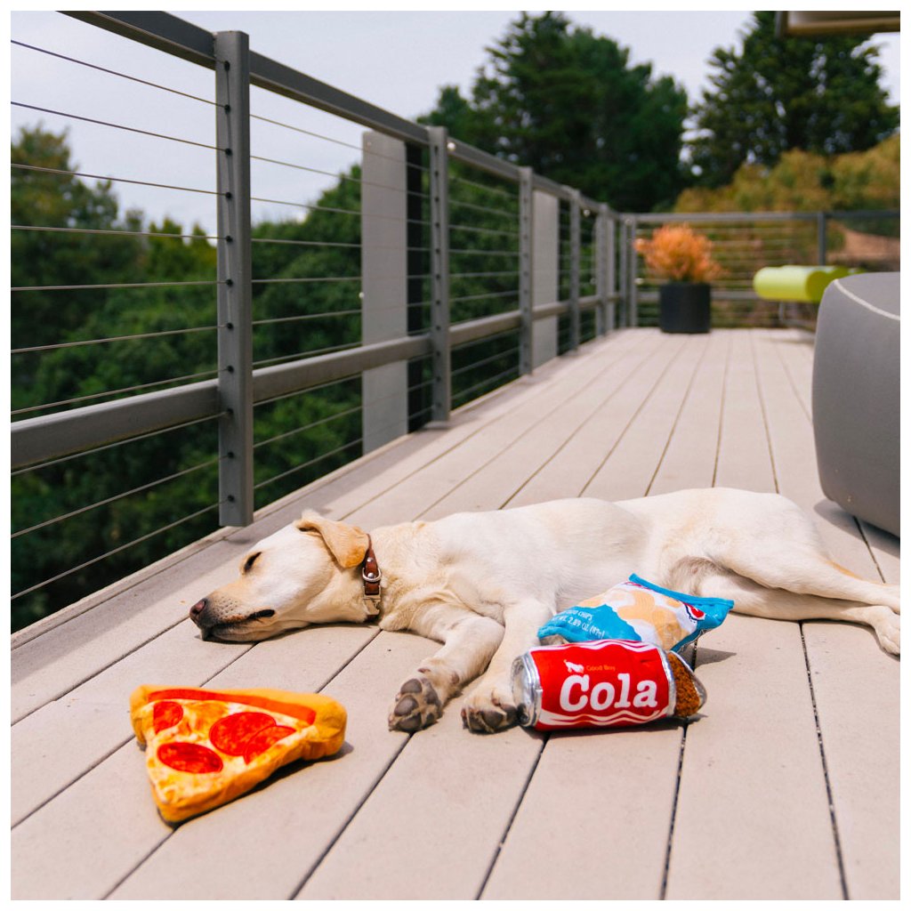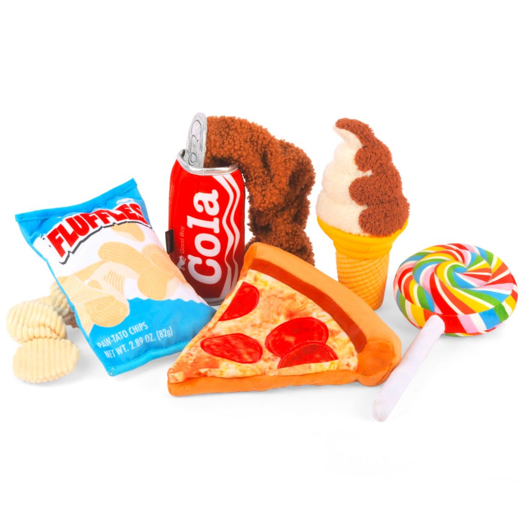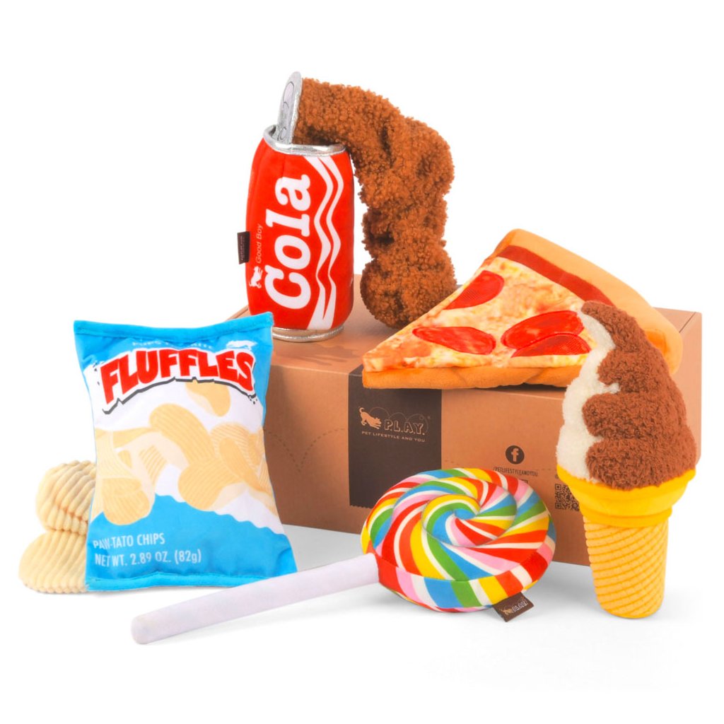 Každý den teď bude cheat day! Oslaďte život vašemu chlupáčovi s originální kolekcí plyšových hraček Snack Attack od kalifornské značky P.L.A.Y. Čeká na něj mlsání bez výčitek: Lahodná Pizza Puppy-roni, Chipsy, osvěžující Cola a Točená zmrzlina. Vybírat můžete ze samostatných hraček, anebo zvolit dárkový set, ve kterém najdete i Lízátko. V prodeji běžné velikosti hraček anebo Mini velikosti pro štěňata a malé psy.