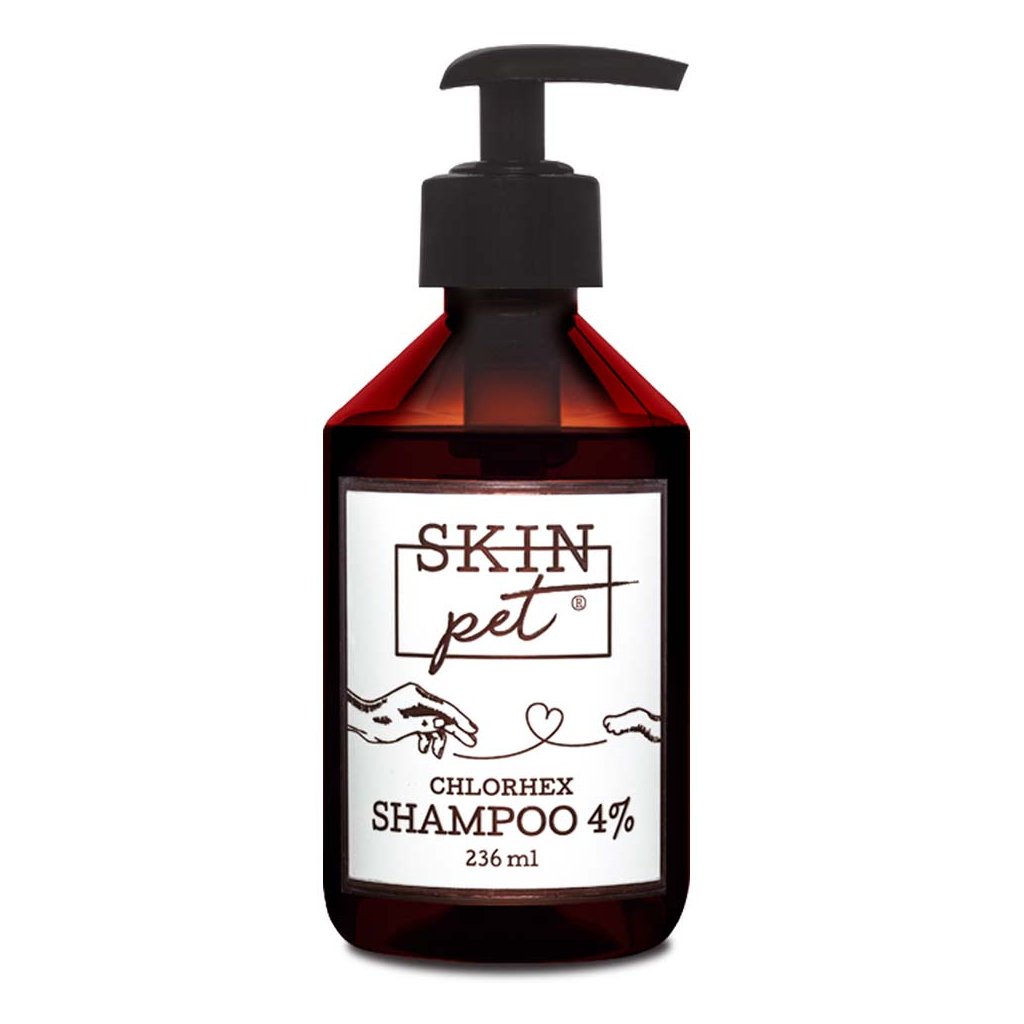 Šampon pro psy a kočky. Vyrobeno v České republice.Šampon pro psy a kočky SkinPet Chlorhex Shampoo 4% brání průniku patogenních organismů a vzniku infekce po operacích, úrazech nebo při infekcích kůže a jiných kožních potížích. Šampon šetrně čistí, eliminuje zápach a navrací srsti přirozený lesk.