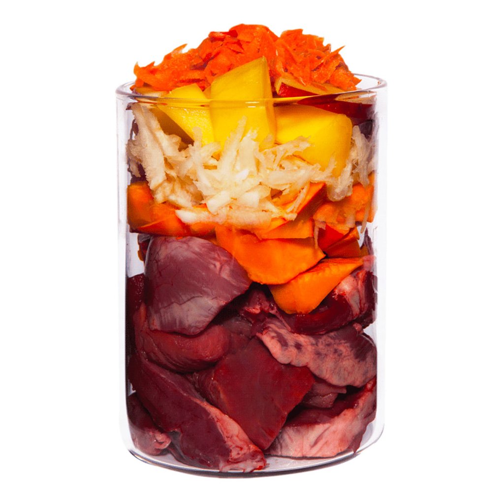 Jehněčí srdce 42 %, jehněčí plíce 12 %, mrkev, dýně 12 %, jablko, pastinák 8 %, broskev, řepkový olej, kokosová mouka, sladká lupina*, pivovarské kvasnice, skořápky ústřice*, mučenka květ* 0,4 %, bazalka*, pampeliška*, šalvěj* 0,2 %, minerální jíl*, andská sůl, květový pyl*, mořská řasa*, minerální látky.