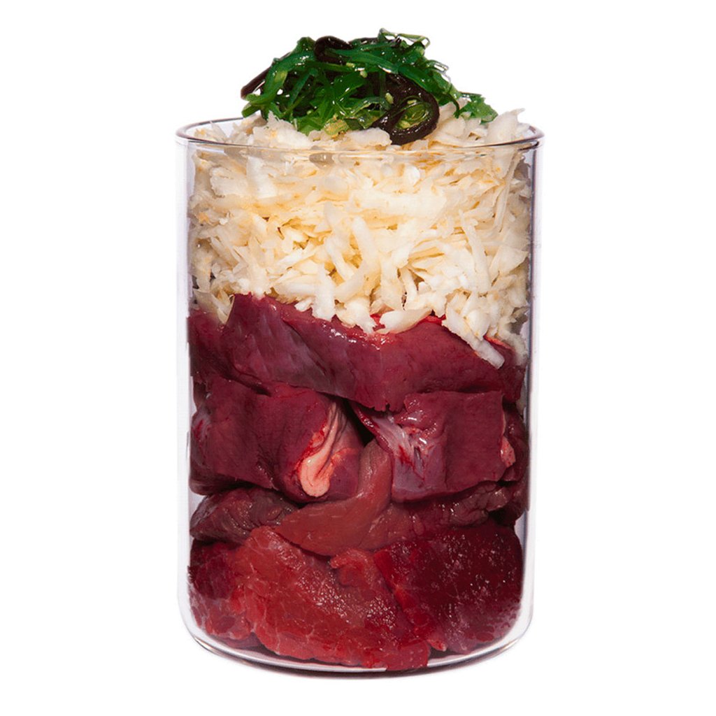 Koňská svalovina 60 %, topinambur 36 %, lněný olej, řepkový olej, mořské řasy*, minerální látky.