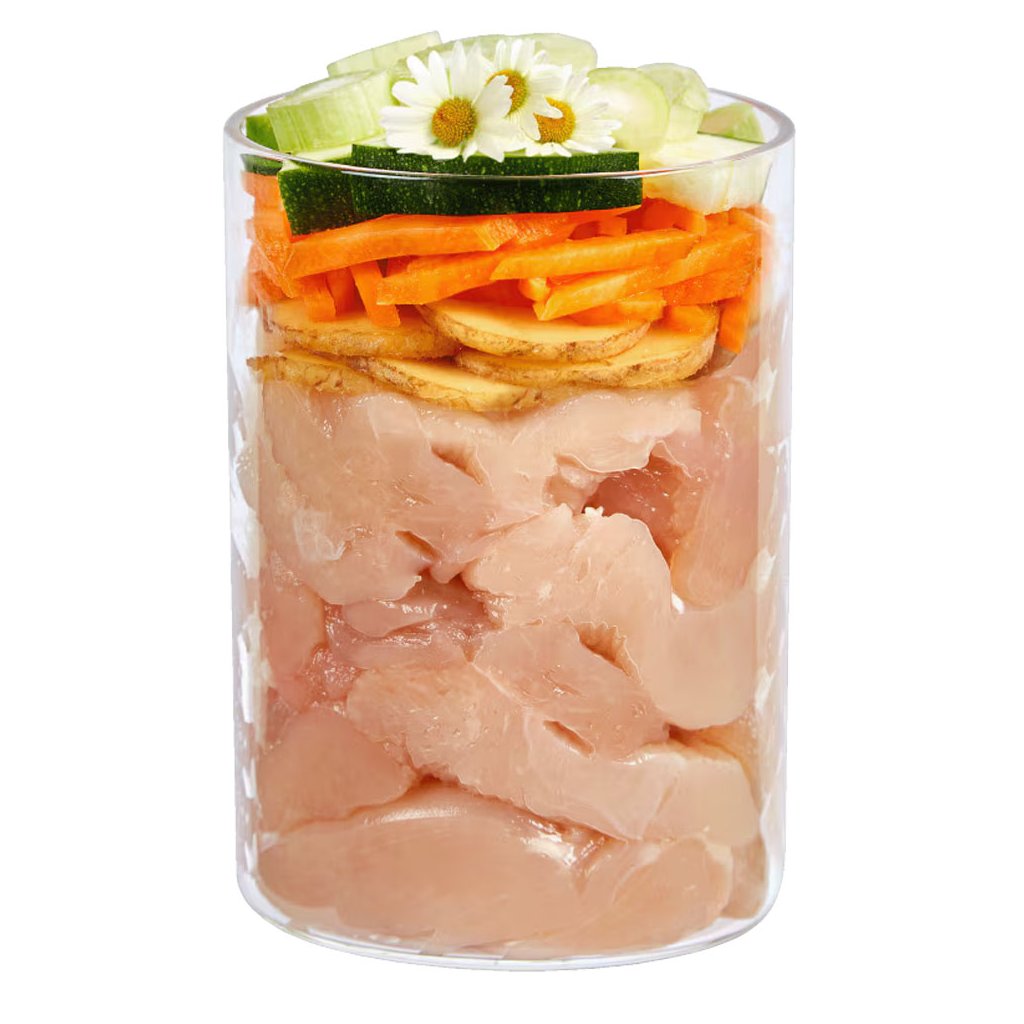 Kuřecí svalovina (30 %), kuřecí žaludek (25 %), mrkev, brambory, cuketa (7 %), brokolice (4 %), celer, celulóza, jahody (2 %), borůvky, řepkový olej, MCT olej, minerální látky, kokosová moučka (1 %), heřmánek* (0,4 %), minerální jíl*, směs Emiko® EM (0,25 %), saturejka*, slupky psyllia*, lněné semínko, kmín*, řebříček*, jinan*, anýz*, andská sůl, mořské řasy*, ústřicové skořápky*.