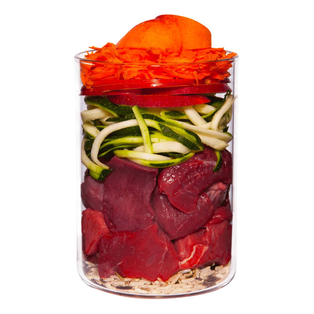 Hovězí srdce 30 %, cuketa, mrkev 12 %, hovězí plíce 11 %, jablko 9 %, hovězí játra 7 %, přírodní rýže 6 %, hovězí svalovina 4,5 %, meruňka, řepkový olej, skořápky ústřice*, pivovarské kvasnice*, bazalka*, semena fenyklu*, petržel*, minerální jíl*, šípkový prášek*, mořské řasy*, minerální látky.