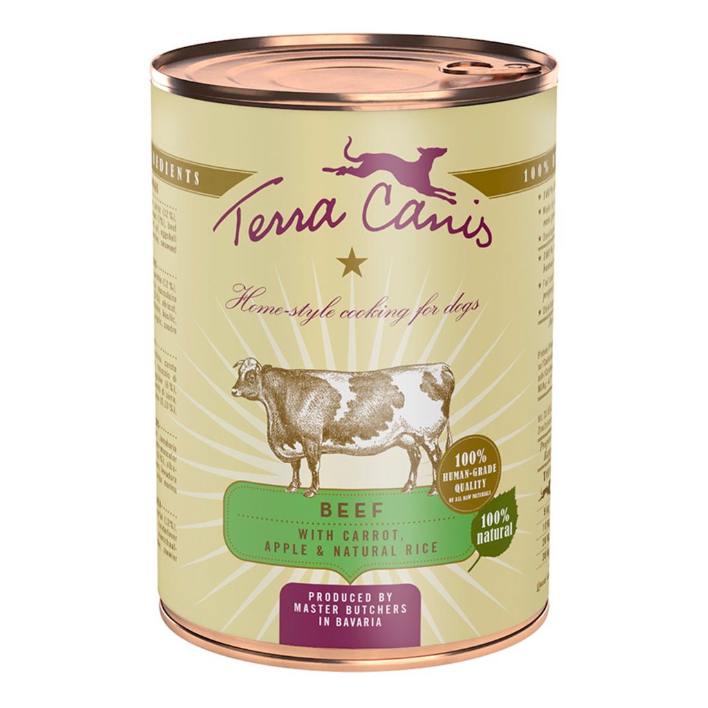 Kompletní krmivo pro psy. 100 % složek v potravinářské human grade kvalitě.Konzervy Terra Canis Classic obsahují vysoký podíl svaloviny (včetně klasické svaloviny, ale i srdcí a žaludků - dutých svalových orgánů). V konzervách najdete taky spoustu čerstvého ovoce, zeleniny a bylinek. Dobře stravitelné, bezlepkové pseudoobiloviny jako proso, amarant nebo rýže natural jsou zastoupeny ve velmi malém množství 4 – 10 %.