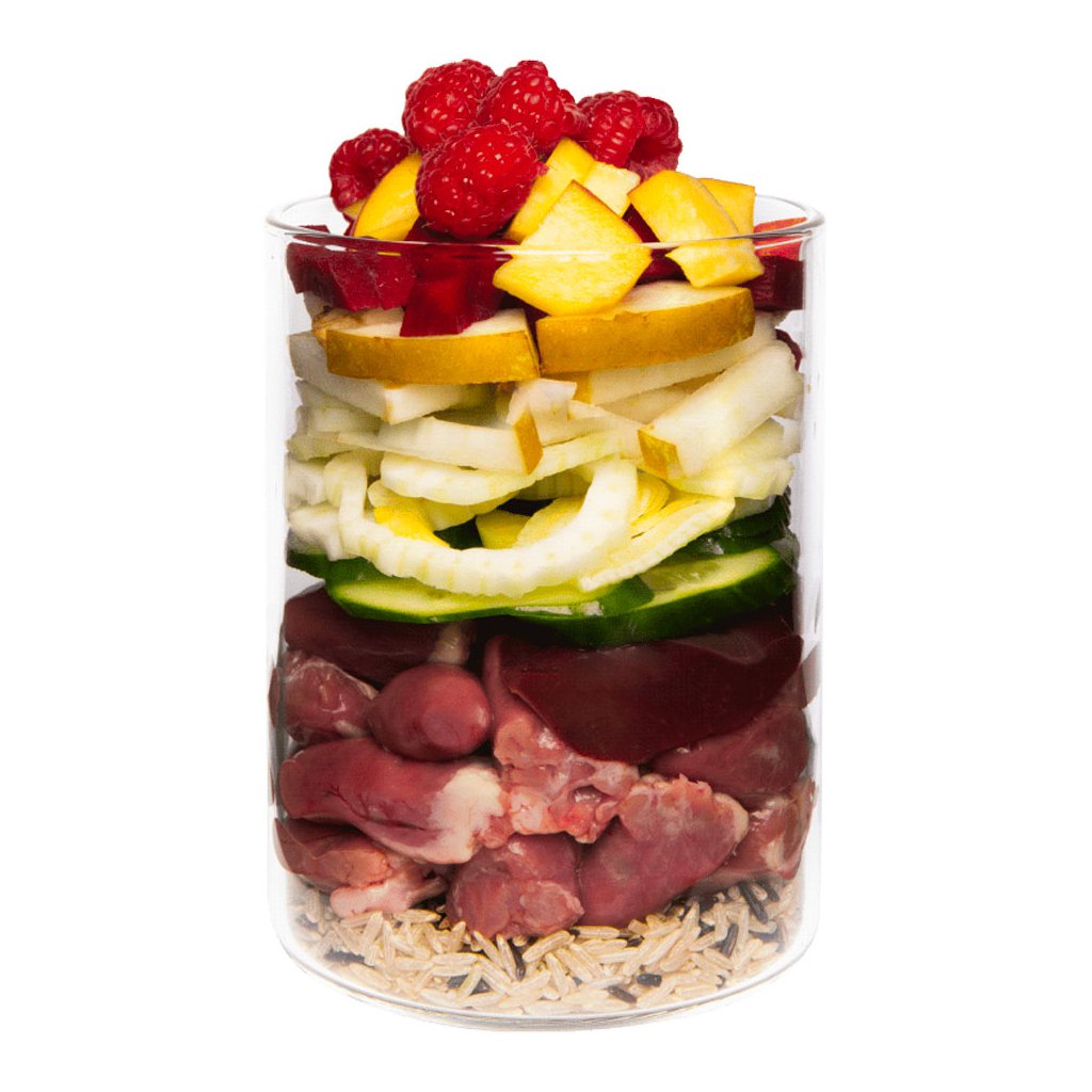 Kachní srdce 42 %, kachní játra 11 %, hruška 7 %, broskev, fenykl, okurka, přírodní rýže 7 %, červená řepa* 7 %, malina 1,5 %, řepkový olej, skořápky ústřice*, mletý sezam* 0,4 %, pivovarské kvasnice*, kmín*, majoránka*, tymián*, minerální jíl*, andská sůl, mořské řasy*, minerální látky.
