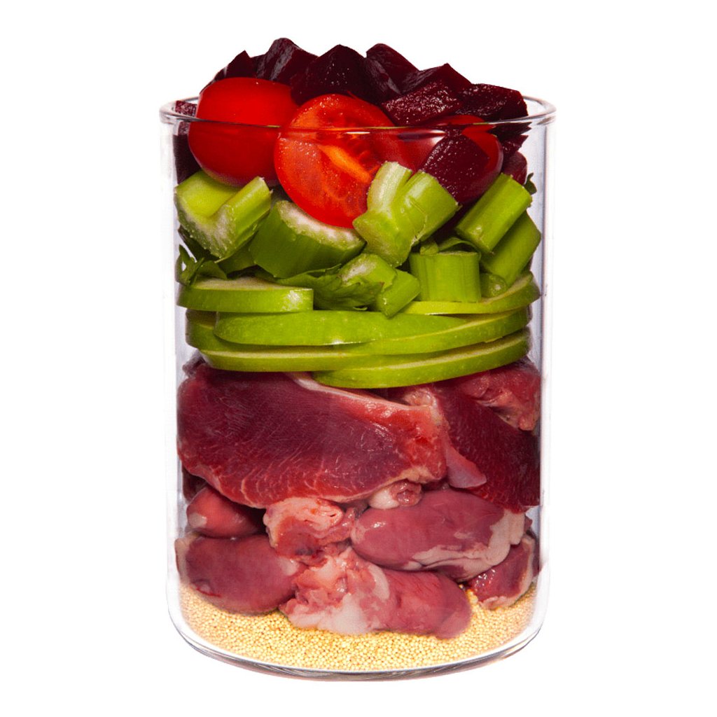 Kuřecí srdce 24 %, rajčata 17 %, kuřecí žaludky 16 %, kuřecí játra 11 %, hruška, amarant 5 %, kuřecí svalovina 4 %, jáhly, červená řepa*, řapíkatý celer, kokosová moučka, řepkový olej, skořápky ústřice*, pivovarské kvasnice*, bazalka* 0,4 %, pažitka*, minerální jíl*, andská sůl, šípek*, mořské řasy*, minerální látky.