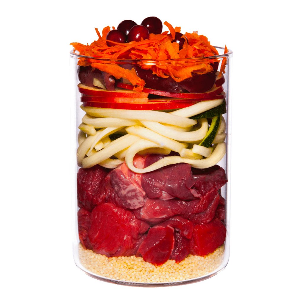Hovězí srdeční svalovina 30 %, hovězí plíce 14 %, cuketa, mrkev 11 %, hovězí játra 7 %, proso, hovězí svalovina 5 %, jablko 4 %, lněný olej, dýně mouka ze semínek 1 %, skořápka ústřice*, pivovarské kvasnice*, brusinka, bazalka*, petržel*, křemelina*, šípkový prášek* 0,2 %, minerální jíl*, andská sůl, pyl*, mořské řasy*, minerální látky.