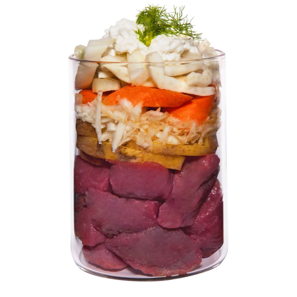 Libové maso je doplněno bramborem, mrkví, fenyklem, probiotickým tvarohem a kokosovou moukou. Menu doplňují zdravé bylinky jako je heřmánek, měsíček, minerální jíl a olej z černých semínek.