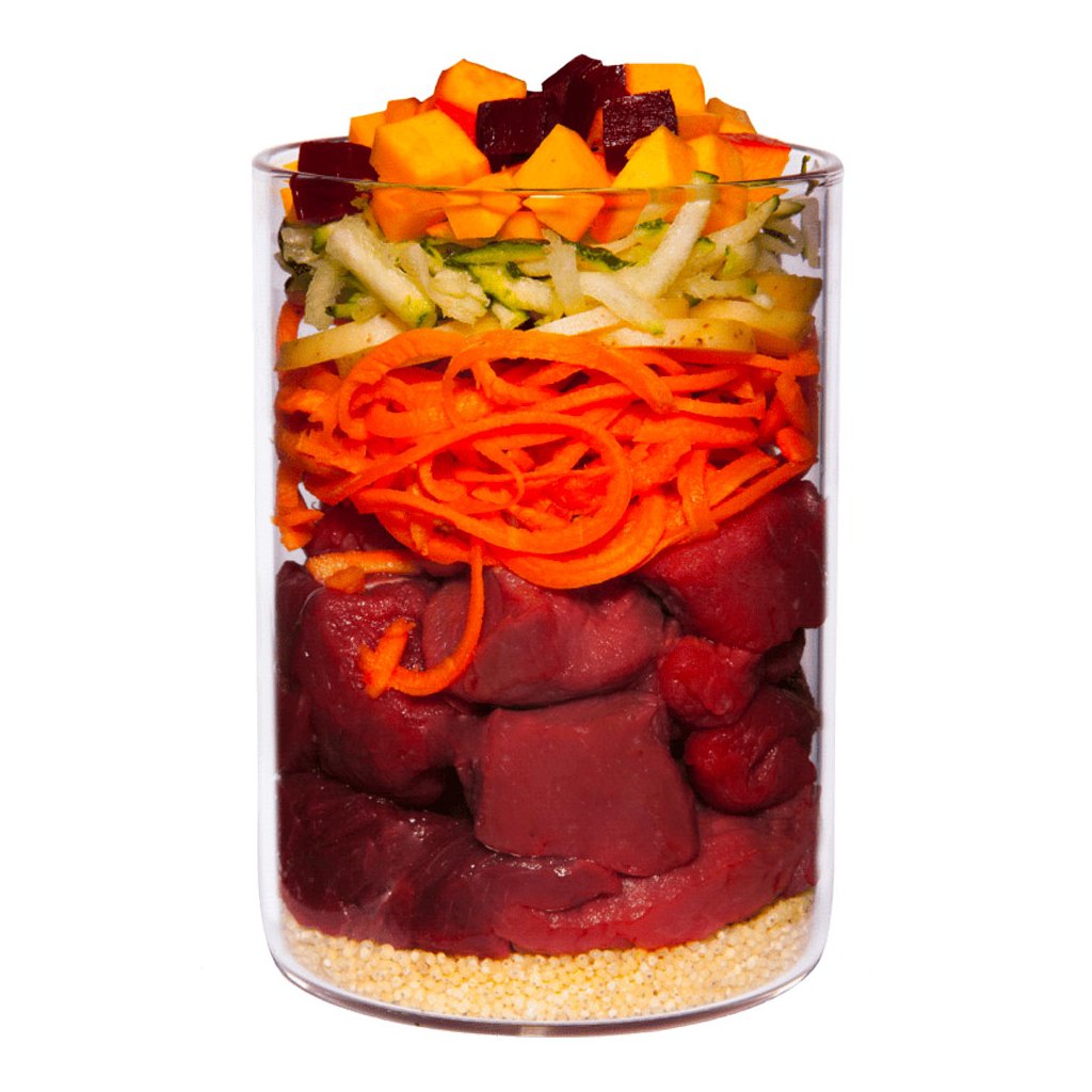 Svalovina ze zvěřiny 47 %, brambory, mrkev, dýně 8 %, cuketa, celer, nízkotučný jogurt, červená řepa*, amarant 3 %, řepkový olej, skořápky ústřice*, pivovarské kvasnice*, brusinky* 0,6 %, pažitka*, bazalka*, minerální jíl*, květový pyl*, mořské řasy*, minerální látky.