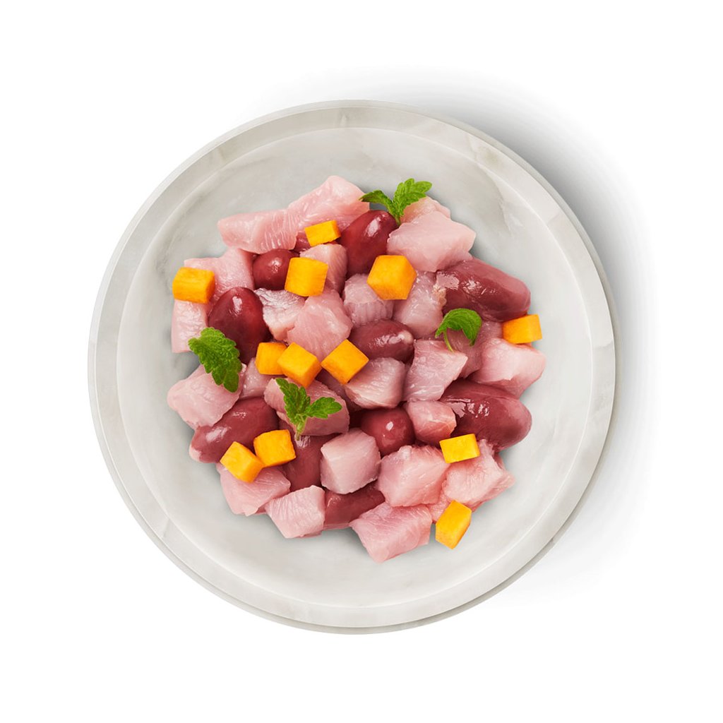 Kuřecí žaludky 20 %, kuřecí kůže 20 %, kuřecí játra 15 %, kuřecí srdce 10 %, krůtí svalovina 10 %, krůtí žaludky 10 %, kuřecí svalovina 5 %, dýně 4 %, rajčatový prášek*, řepkový olej, rybí tuk, šanta kočičí*, minerální látky.