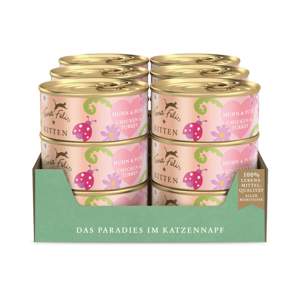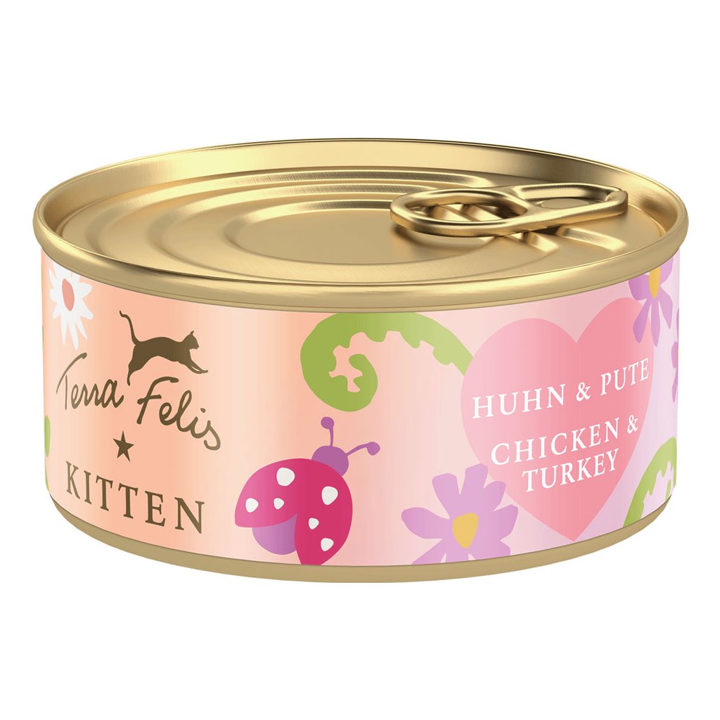 Kompletní krmivo pro koťata. 100 % složek v potravinářské human grade kvalitě.Díky Terra Felis Kitten si mohou malá koťátka konečně pochutnat na kvalitním menu vyrobeném ze 100% surovin ve skutečné potravinářské kvalitě. Konzervy Terra Felis pro koťata nabízejí vše, co koťata potřebují pro zdravý start do života: spoustu čerstvého masa, velké množství energie, esenciálních aminokyselin a živin, stejně jako tu nejlepší chuť a vůni z přírodních surovin.
