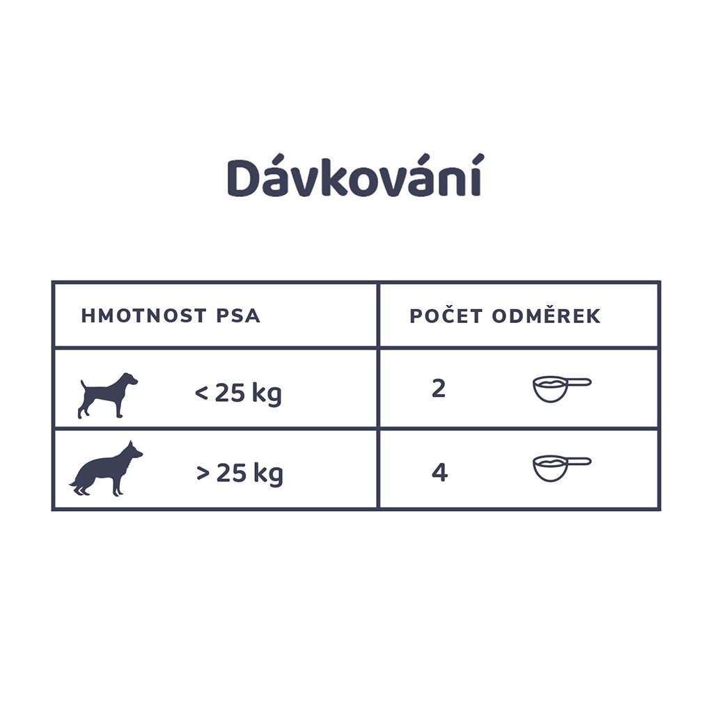 Prášek smíchejte s běžnou stravou vašeho pejska přímo v misce. Dávkujte pomocí přiložené odměrky. Doporučujeme přidat pár kapek rostlinného oleje (např. olivový) a dobře promíchat. Používejte vždy doporučenou denní dávku.
