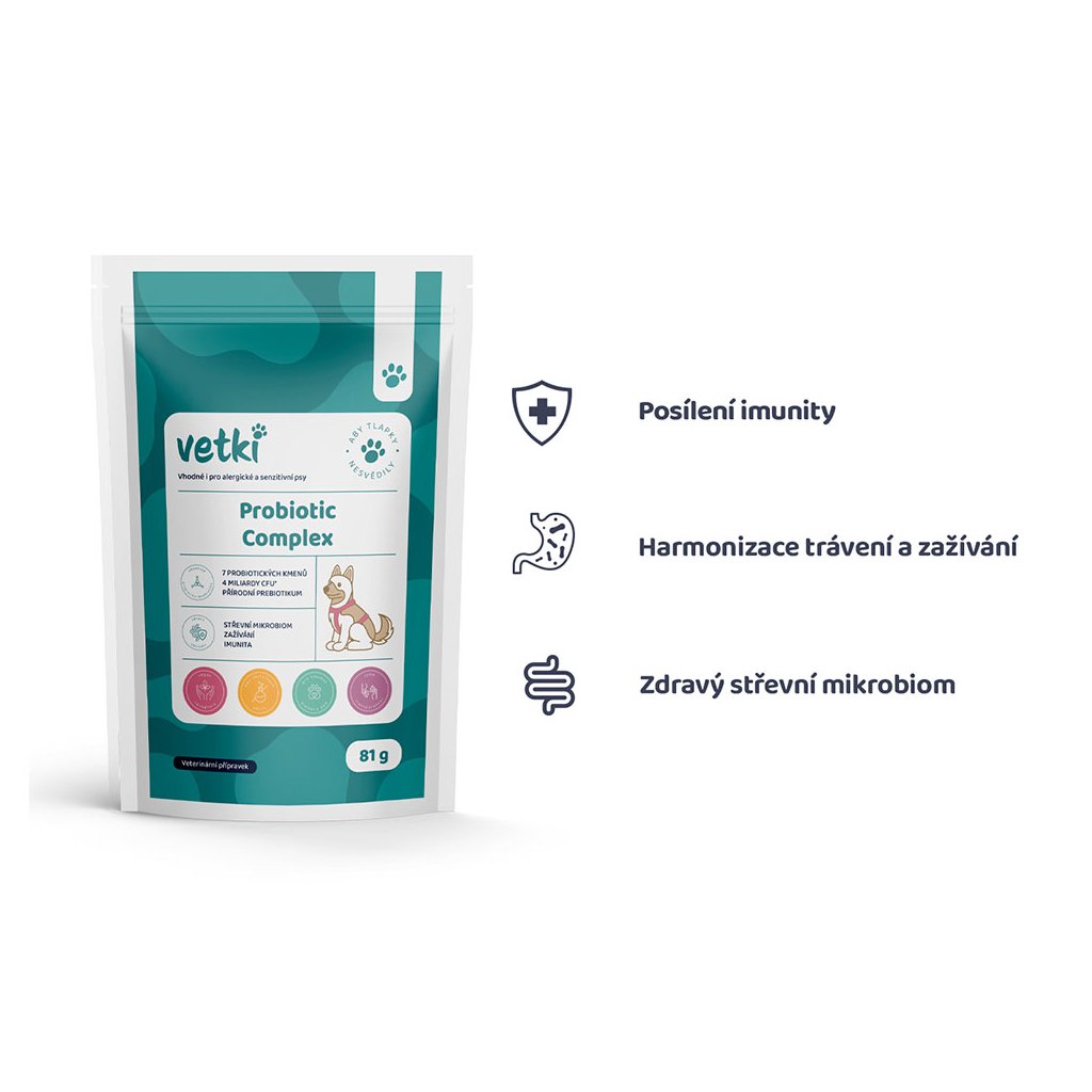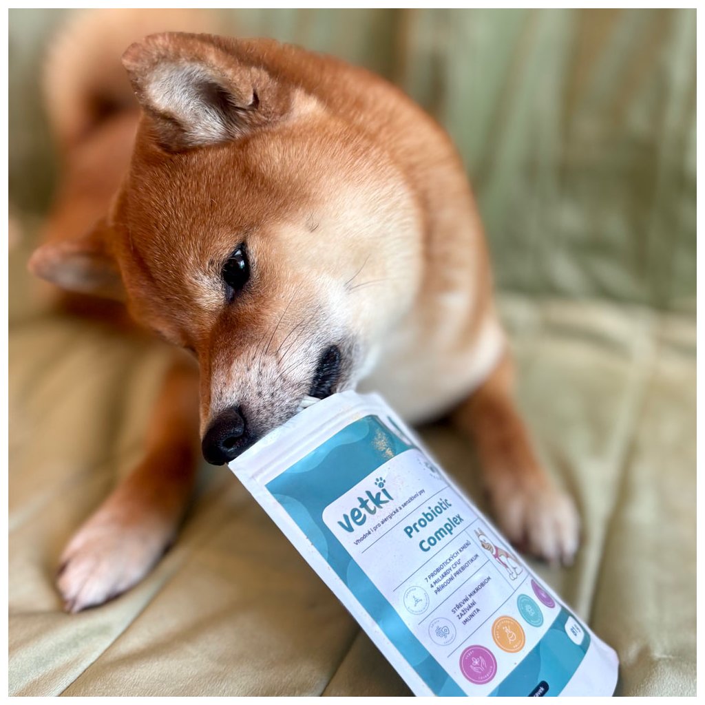 Doplněk výživy pro psy. Vyrobeno v České republice.Podpořte zdraví trávicího systému vašeho pejska s veterinárním přípravkem Probiotic Complex od české značky Vetki. Unikátní kombinací probiotik a přírodních prebiotik z dýně. Tento vysoce účinný doplněk stravy je navržen tak, aby pomáhal udržovat rovnováhu střevní mikroflóry, zlepšil trávení a posílil imunitní systém vašeho psa.