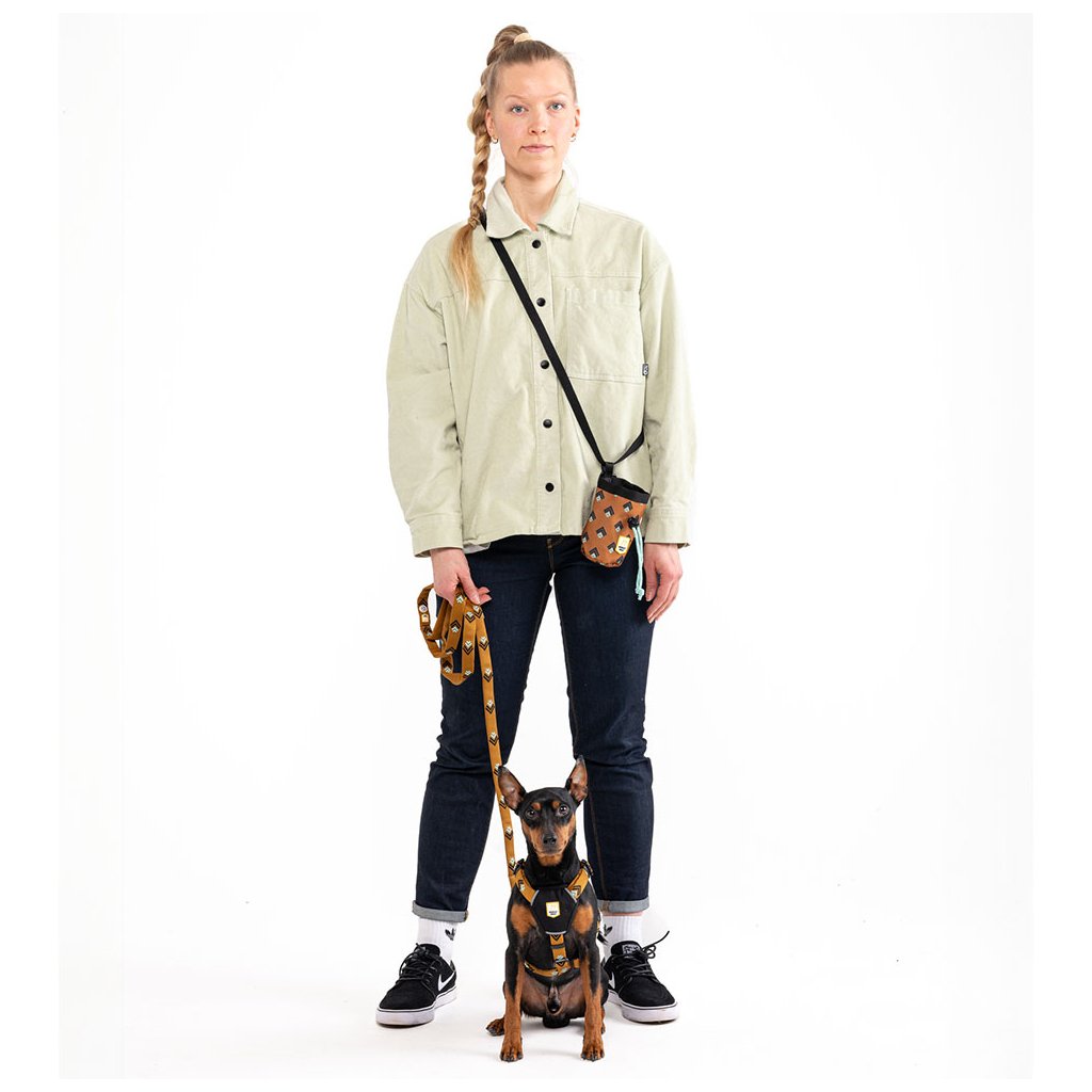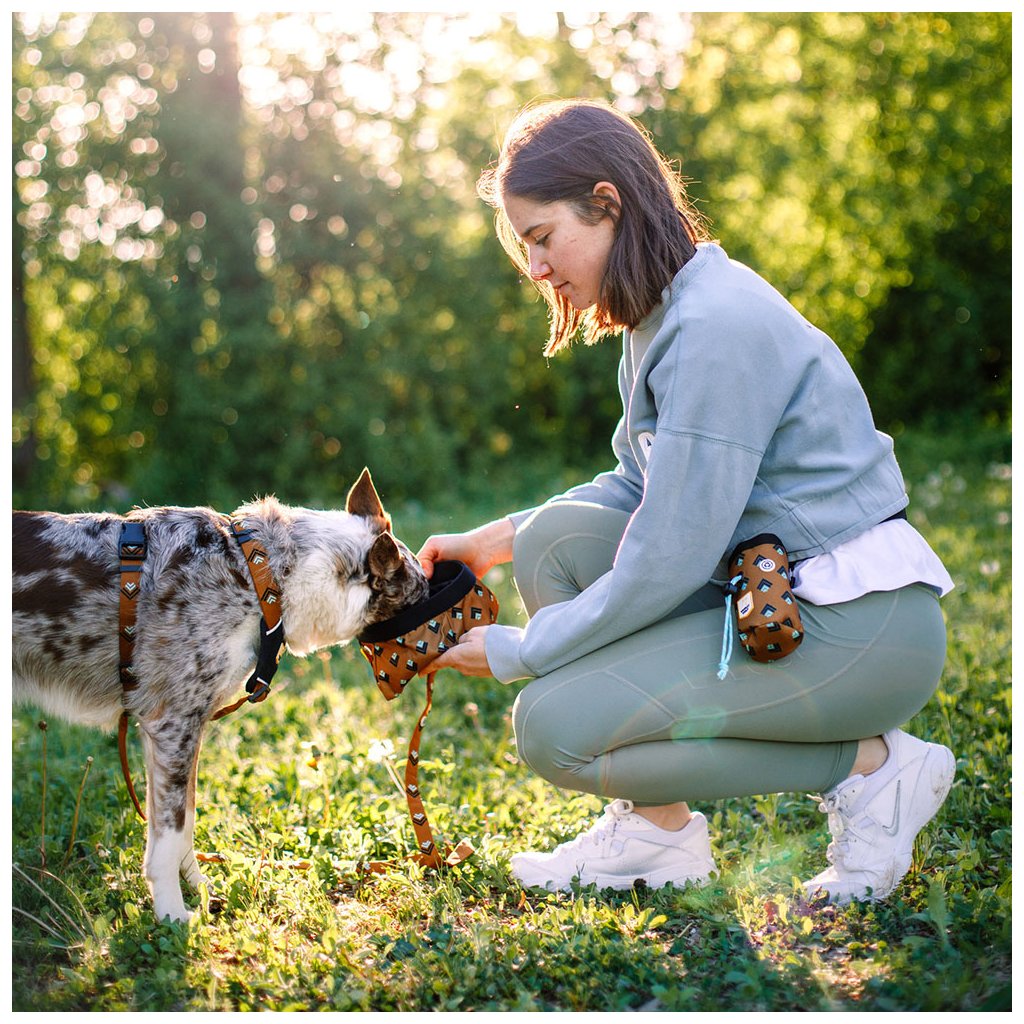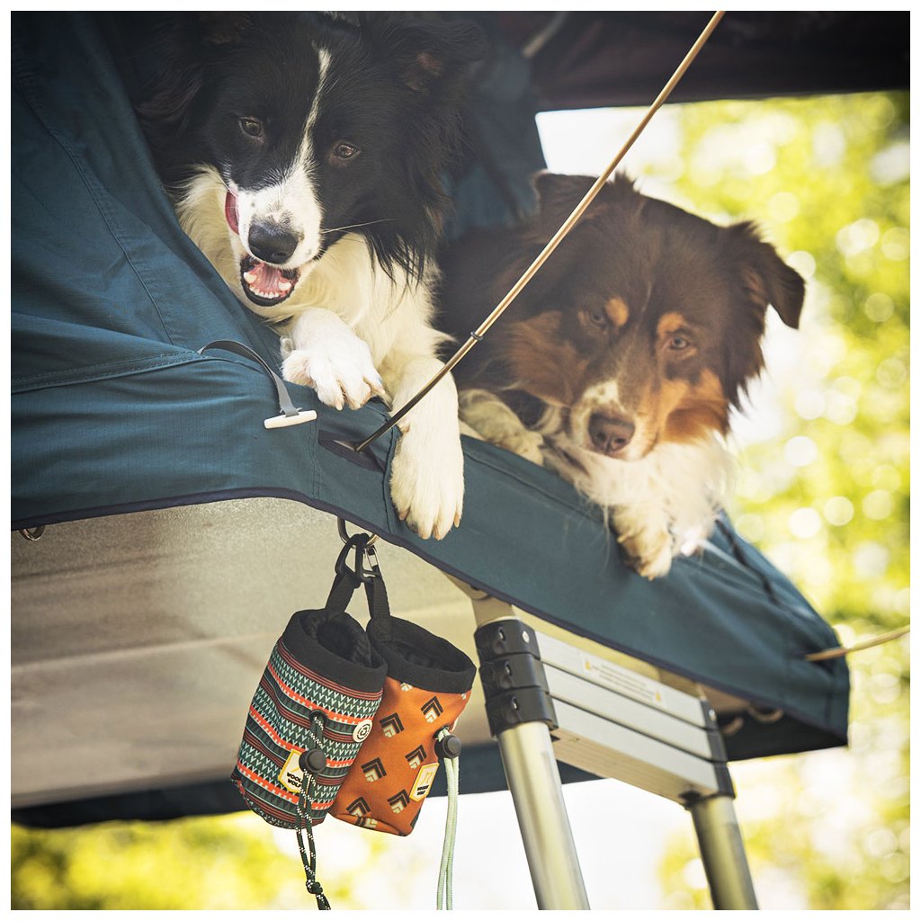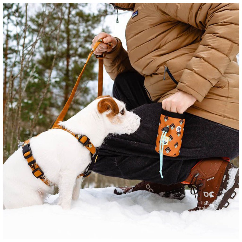 Horní okraj je vyztužen, aby byl přístup k pamlskům rychlý a snadný. Když pamlsky zrovna nepotřebujete, lze pamlskovník uzavřít pomocí stahovací šňůrky. Pamlskovník můžete připnout na batoh anebo použít nastavitelný pás přes tělo.